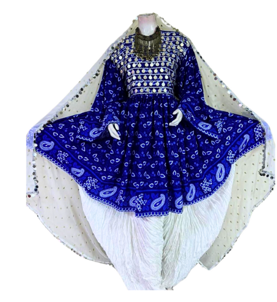 Traditional Afghan Women Simple Short Blue and White Dress.