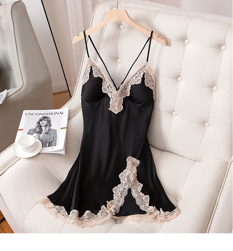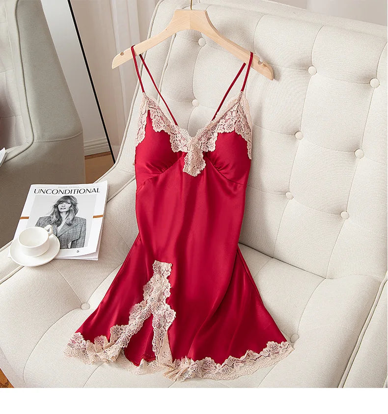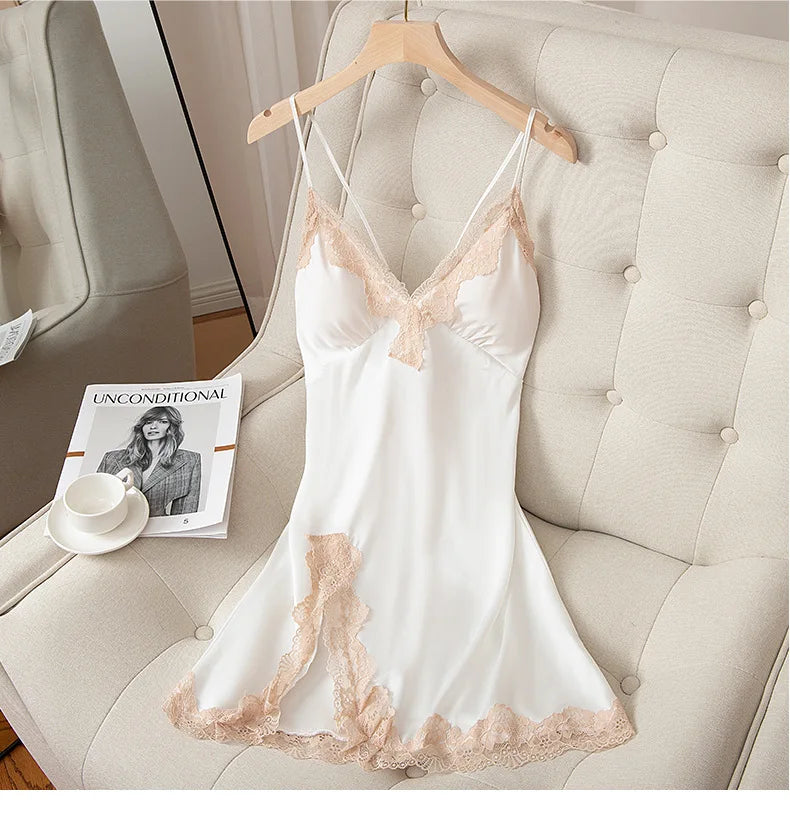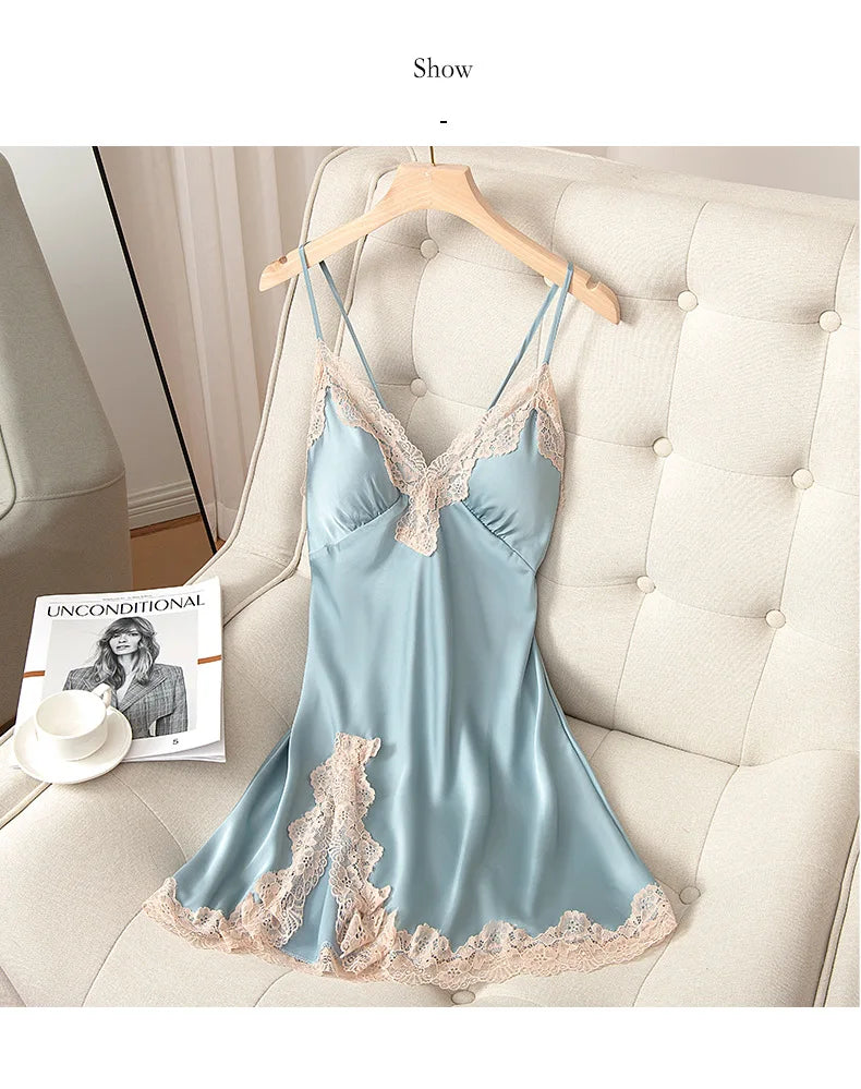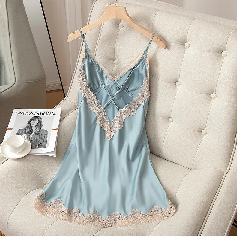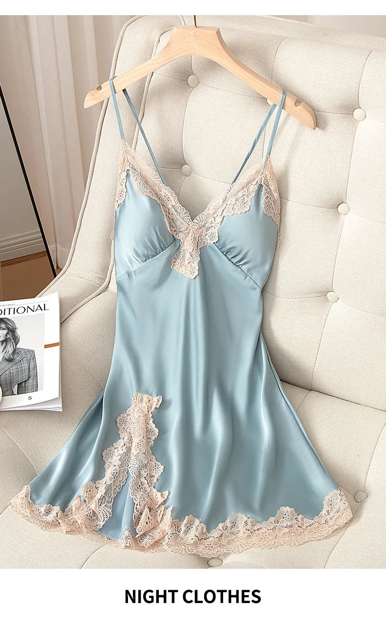 Spaghetti Strap Nightgown Women Nightdress Satin Summer Sexy Intimate Lingerie Soft Sleep Dress V-Neck Home Dressing Gown